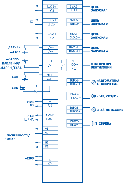 управление установками газового, порошкового и аэрозольного пожаротушения в автоматическом режиме, по команде оператора или при поступлении на вход сигнала от УДП;